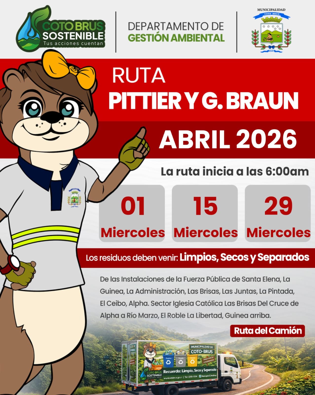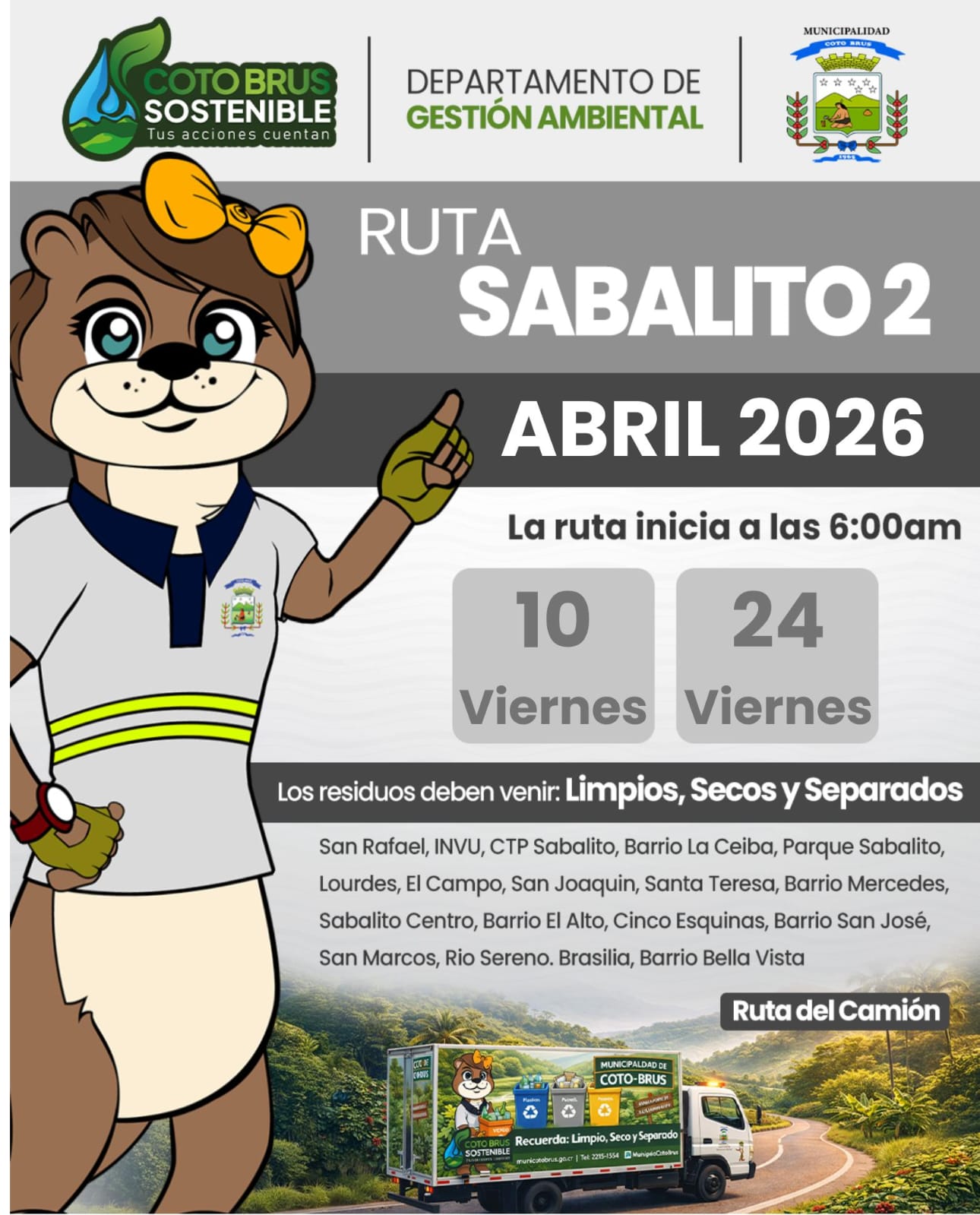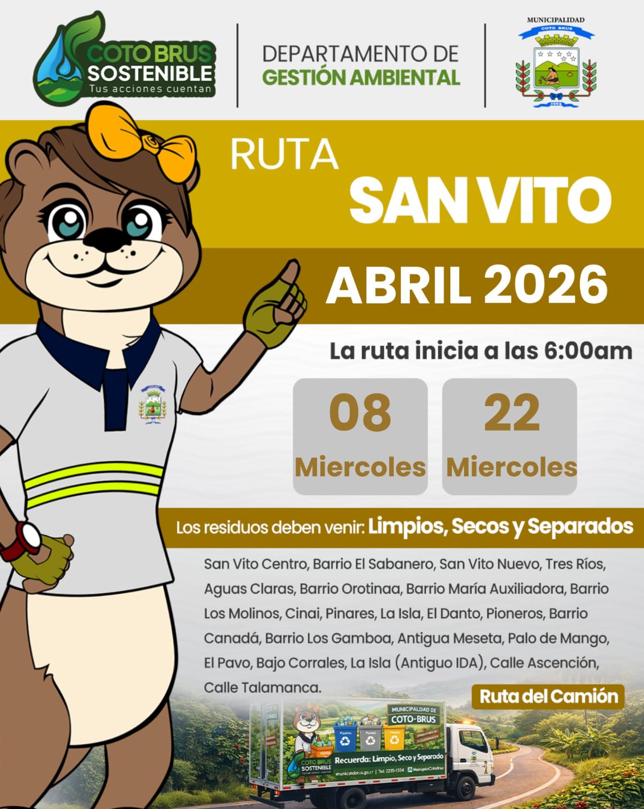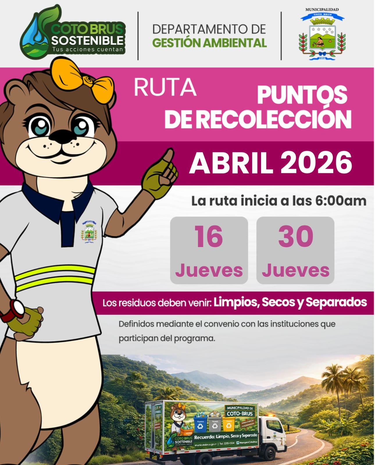 El Departamento de Gestión Ambiental de la Municipalidad de Coto Brus informa a la población las fechas establecidas para la recolección de residuos valorizables correspondientes al mes de abril.