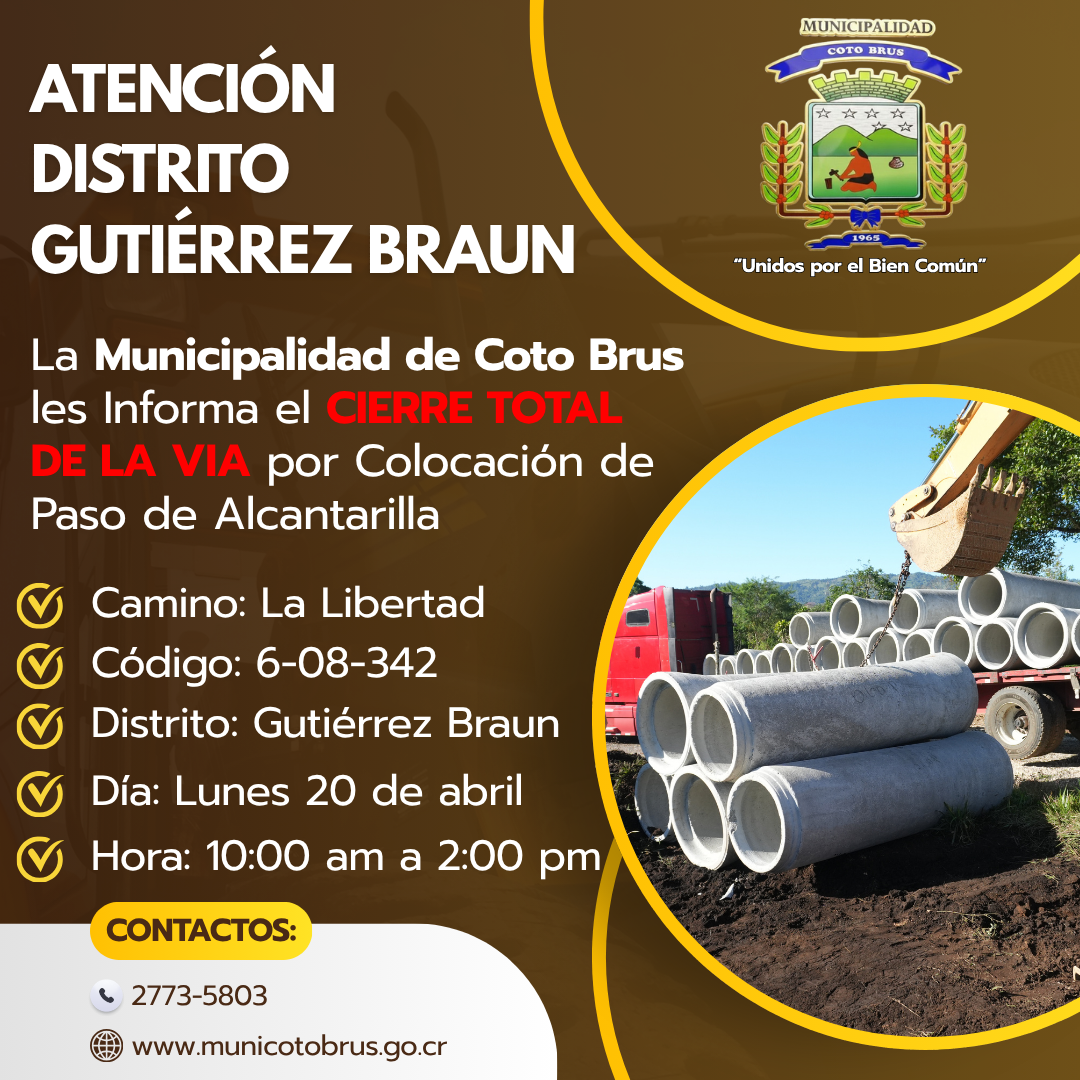 La Municipalidad de Coto Brus informa a la población del distrito de Gutiérrez Braun que, en el Camino La Libertad, se realizará la colocación de un paso de alcantarilla.