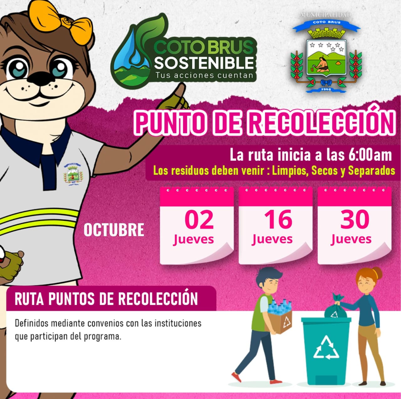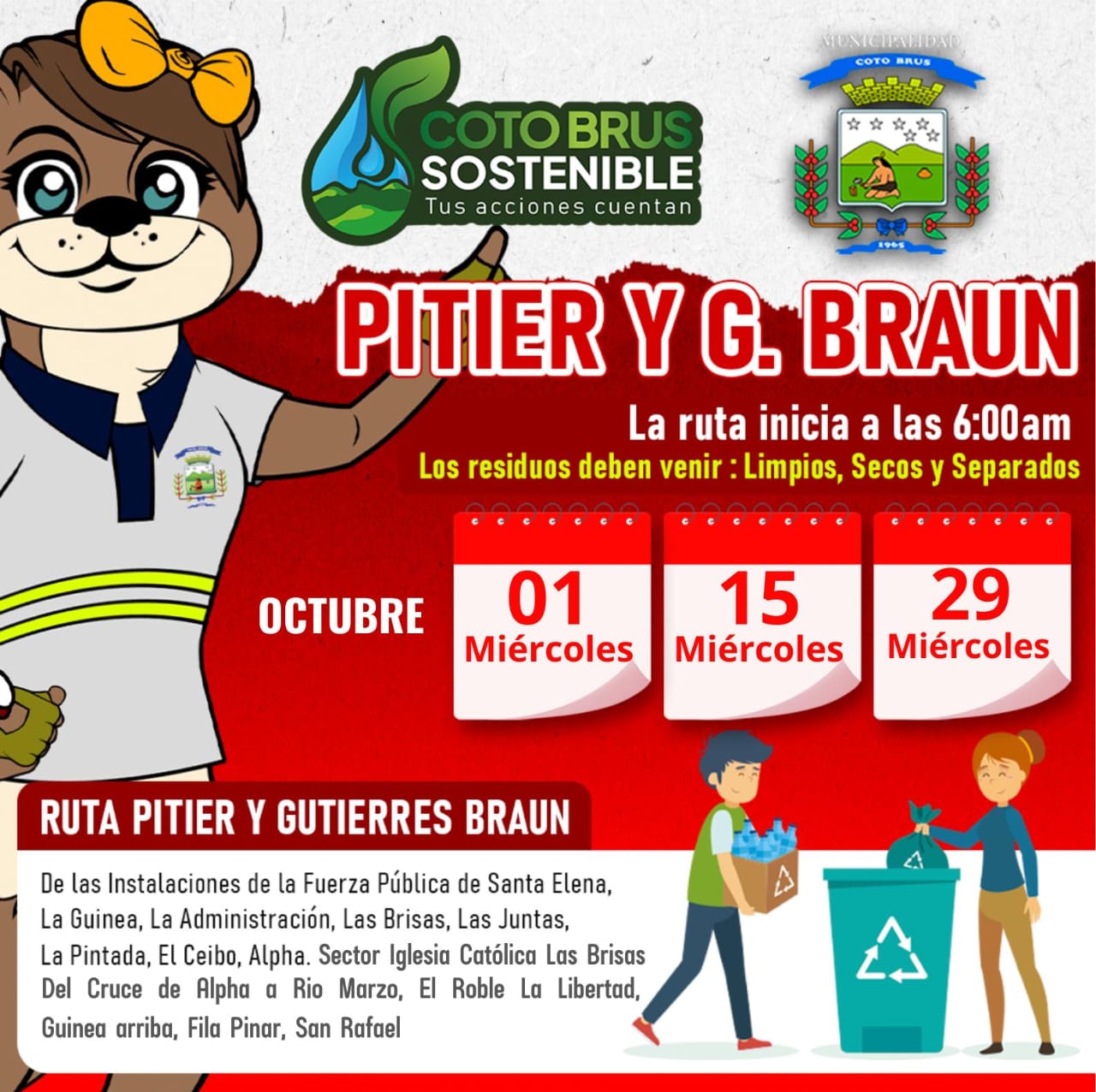 El Departamento de Gestión Ambiental de la Municipalidad de Coto Brus comparte con ustedes las fechas de recolección de residuos valorizables para este mes de octubre.