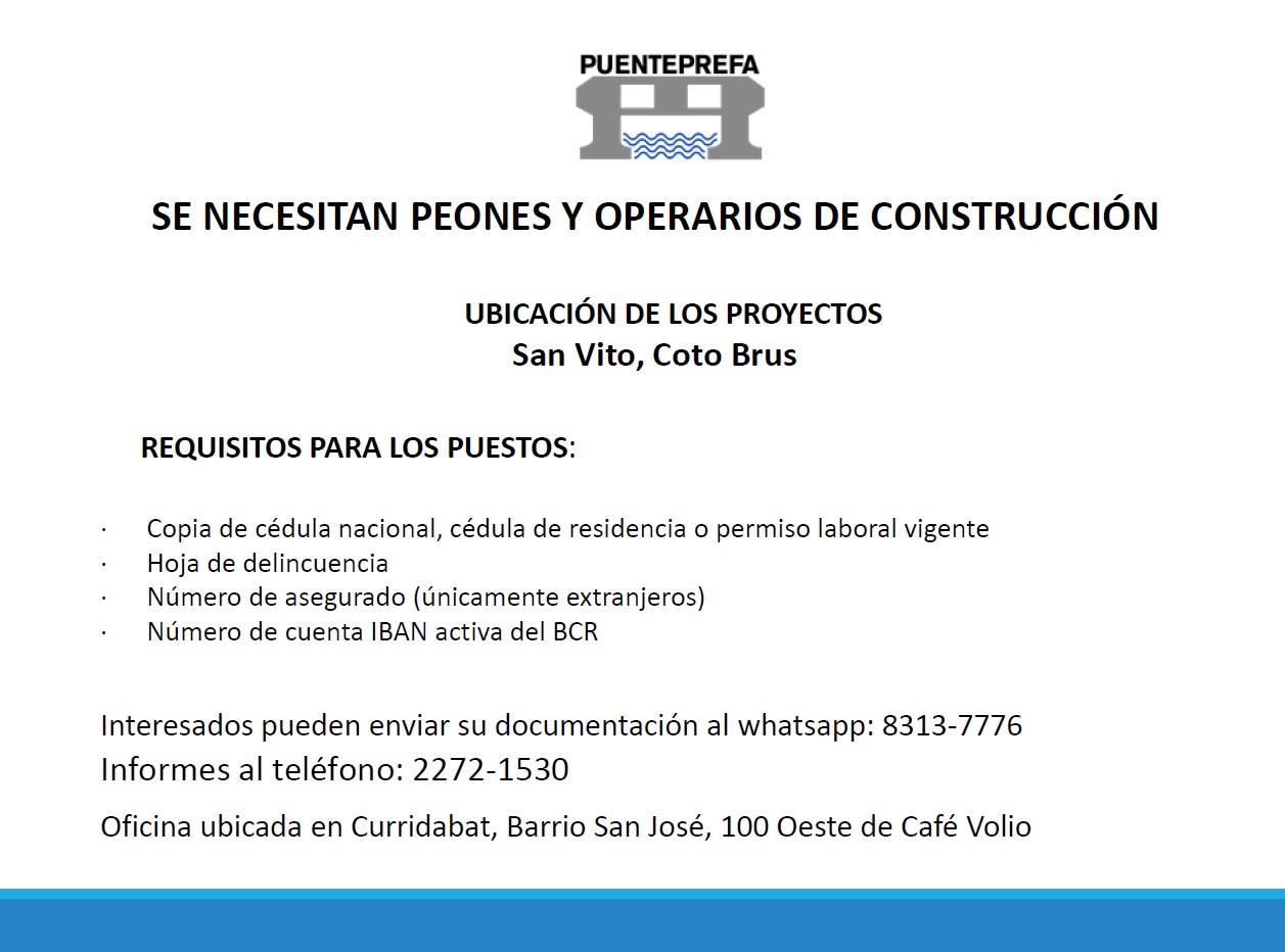 Empresa PuentePrefa, requiere contratar Peones y Operarios de Construcción.