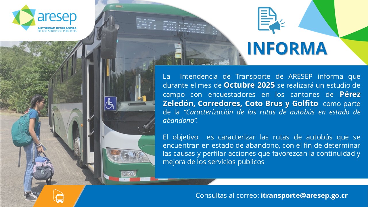 La Autoridad Reguladora de los Servicios Públicos (ARESEP) informa que durante el mes de noviembre de 2025 se realizará un estudio de campo en el cantón de Coto Brus, como parte de la evaluación del estado de las rutas de autobús en condición de abandono.
