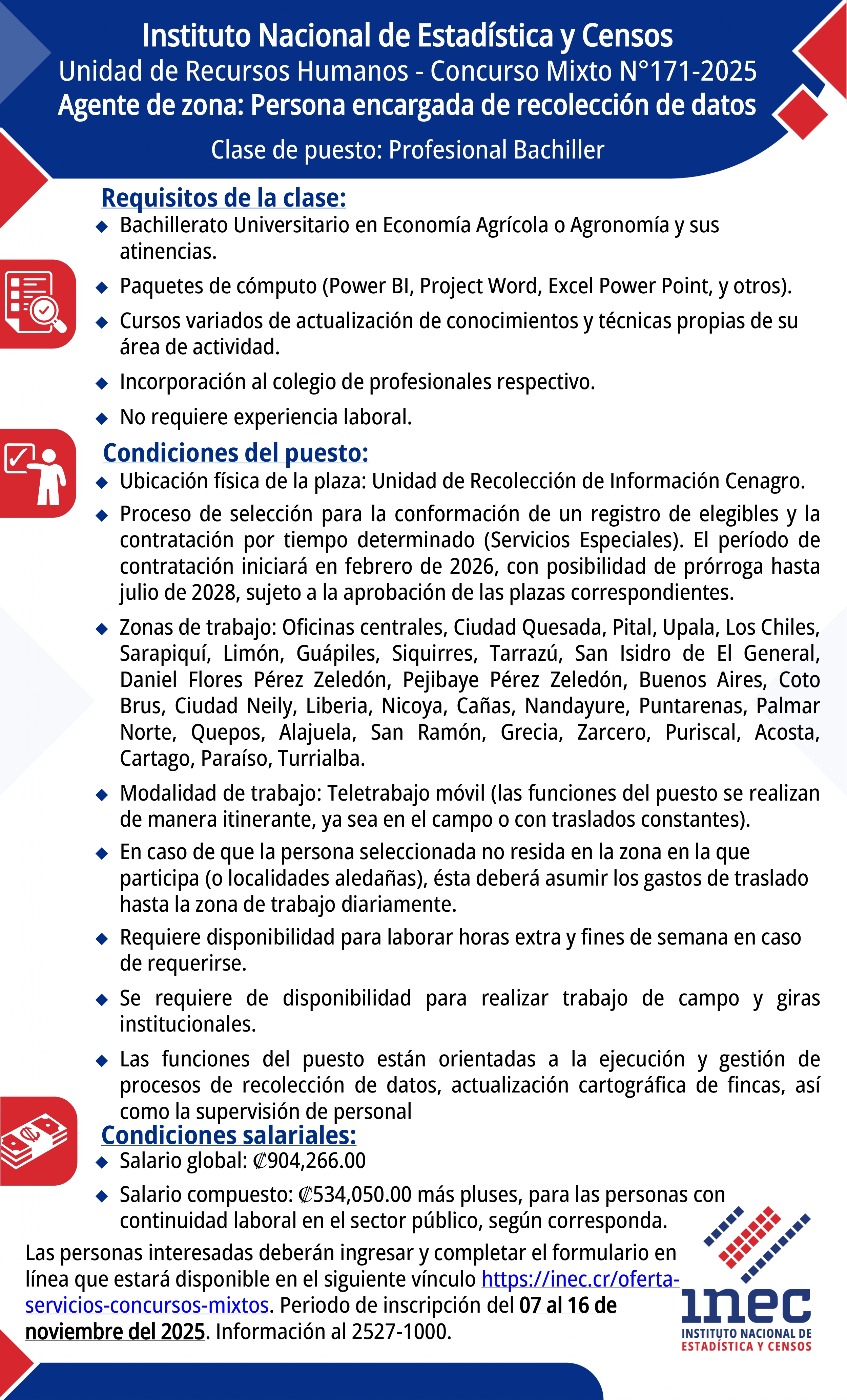 El Instituto Nacional de Estadística y Censos, requiere contratar personas encargadas de recolección de datos.
