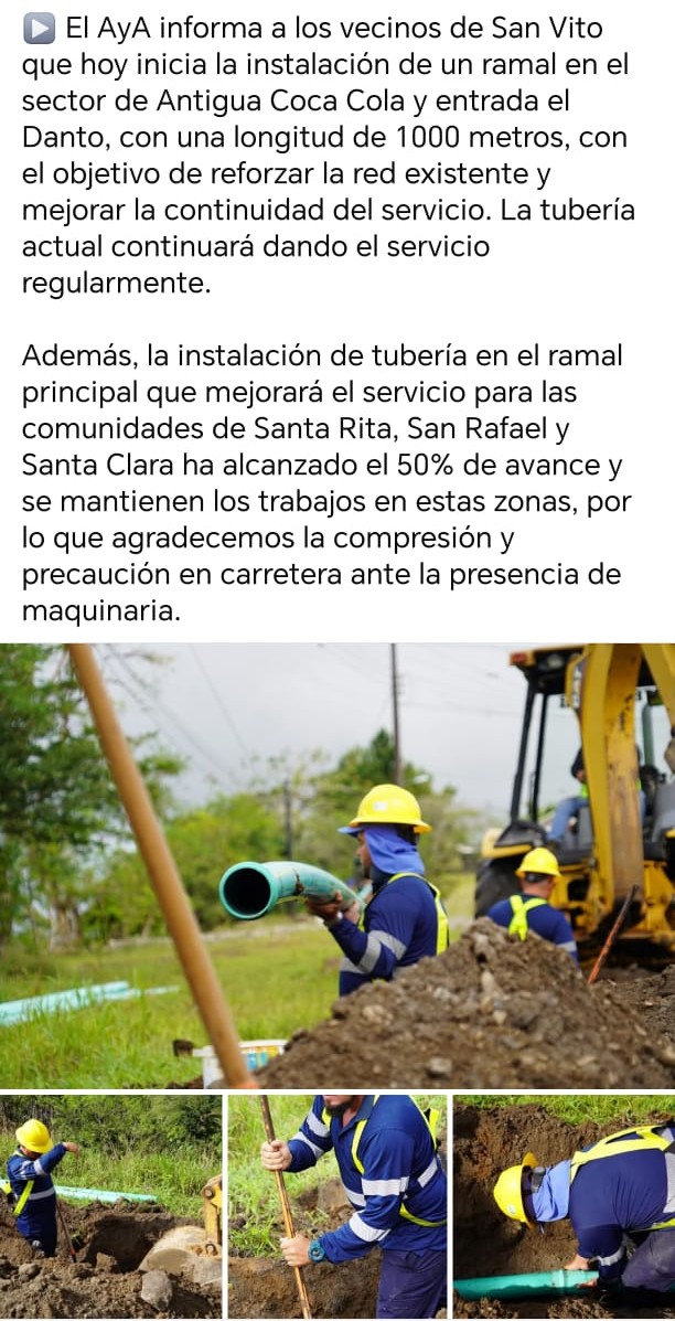 El AyA informa sobre trabajos que se estarán realizando en distintos sectores del cantón, con el objetivo de mejorar la red de abastecimiento y garantizar la continuidad del servicio.
