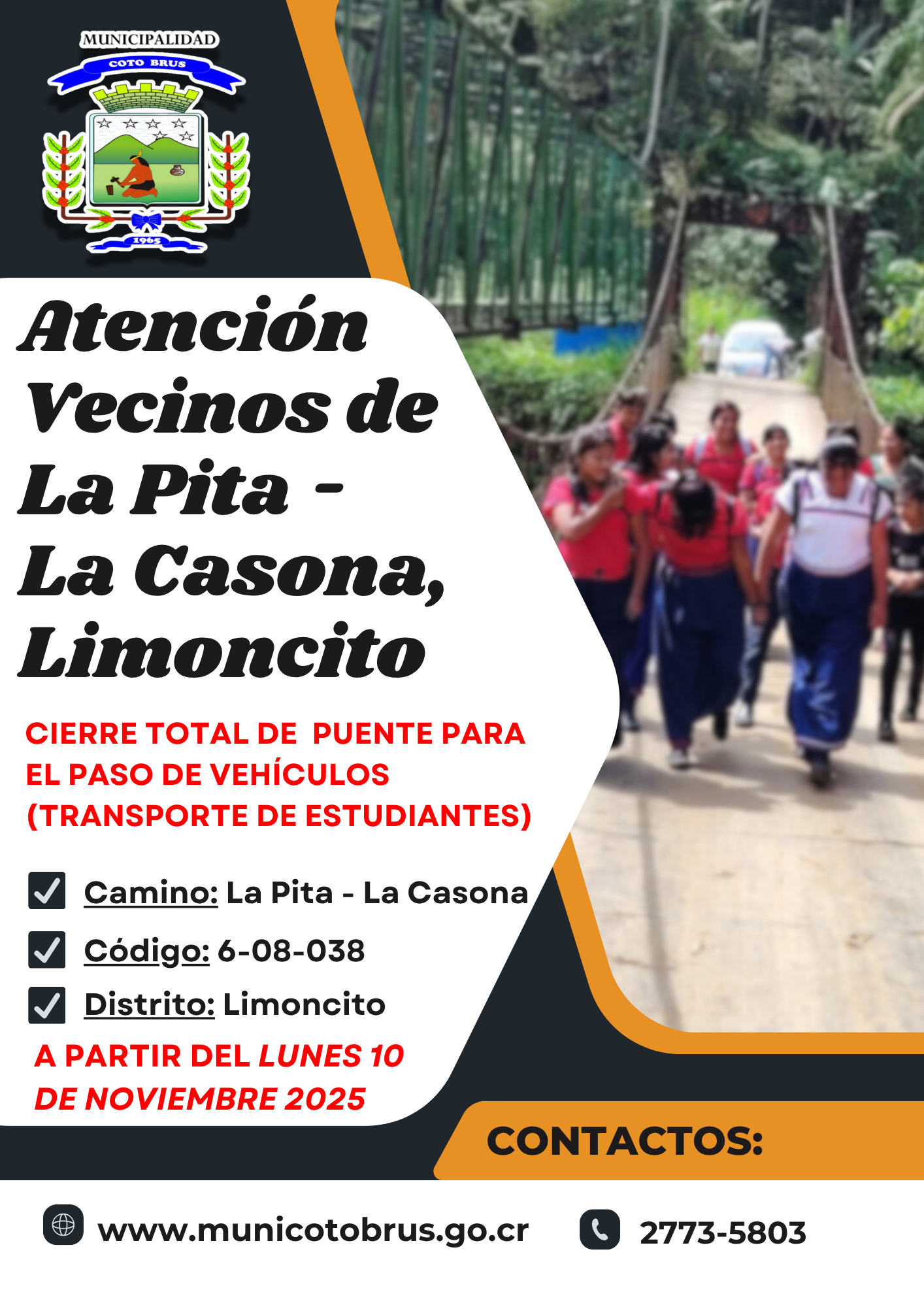 La Municipalidad de Coto Brus informa que el puente La Pita - La Casona, en el distrito de Limoncito, permanecerá cerrado al paso vehicular.