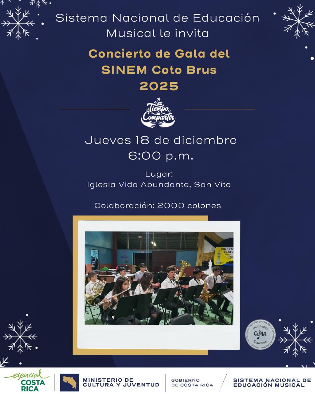 La cordialmente invitación a disfrutar del Concierto de Gala del SINEM Coto Brus 2025, una noche especial llena de música, talento y emoción.