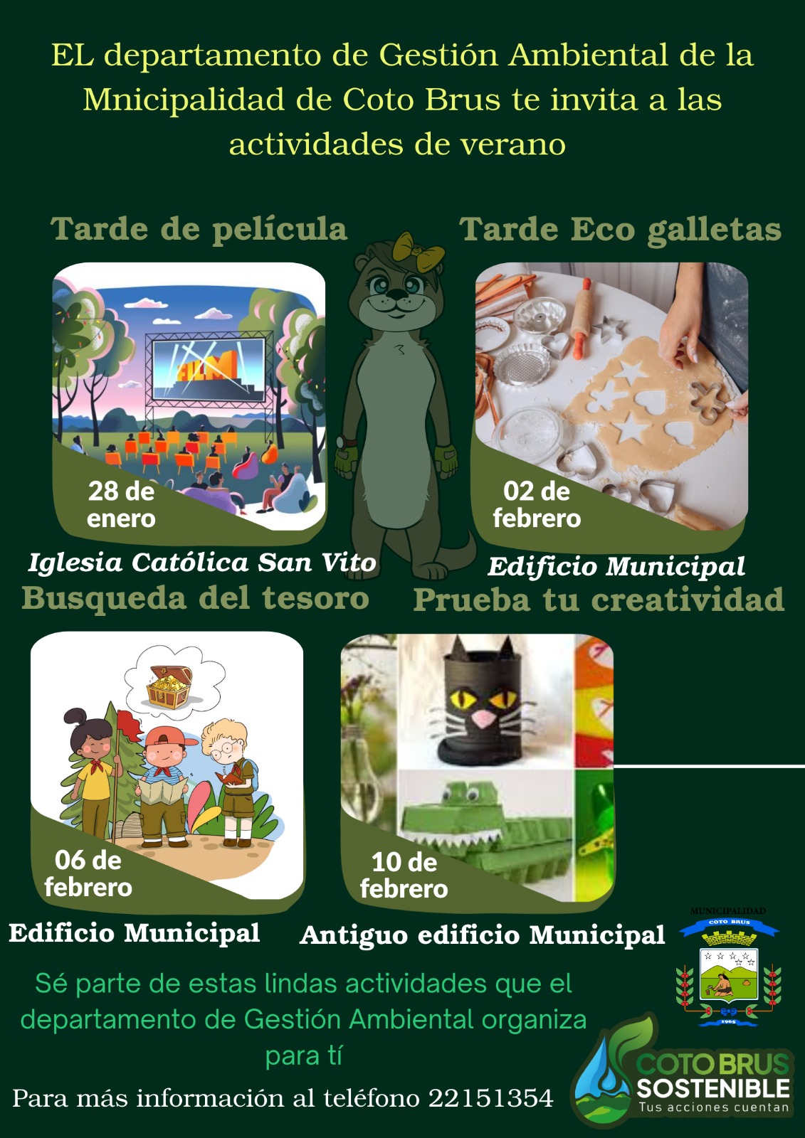La Municipalidad de Coto Brus por medio del departamento de Gestión Ambiental tiene el agrado de invitar a niñez y población en general a las actividades de verano 2026, iniciando con la actividad "Tarde de Cine" el miércoles 28 de enero en la plazoleta de la Iglesia Católica de San Vito a partir de las 5:00 pm, el lunes 02 de febrero "Tarde de Eco Galletas" en instalaciones de la Municipalidad de 1:00 pm a 3:30 pm, viernes 06 de febrero "Búsqueda del Tesoro" en instalaciones de la Municipalidad de 1:00 pm a 3:30 pm y el martes 10 de febrero "Prueba tu Creatividad" en instalaciones del antiguo edificio de la Municipalidad de 1:00 pm a 3:30 pm.