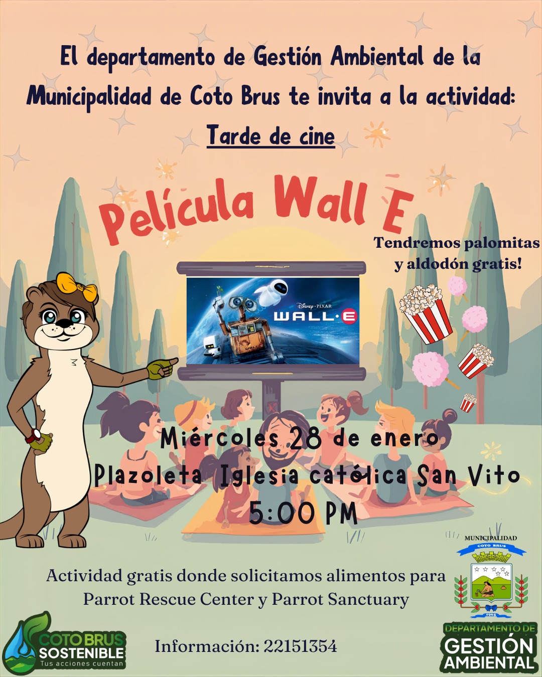 La Municipalidad de Coto Brus por medio del departamento de Gestión Ambiental tiene el agrado de invitar a niñez y población en general a las actividad de verano Tarde de Cine" a celebrarse este miércoles 28 de enero en la plazoleta de la Iglesia Católica de San Vito a partir de las 5:00 pm