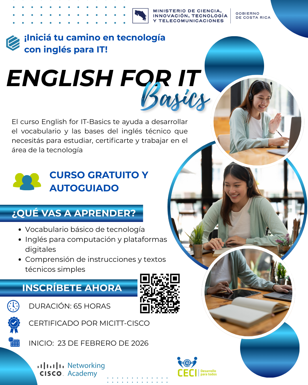 Como parte de los esfuerzos del Ministerio de Ciencia, Innovación, Tecnología y Telecomunicaciones (MICITT) por impulsar la apropiación social del conocimiento, fortalecer las competencias digitales de la ciudadanía y mejorar los perfiles de empleabilidad, especialmente en el marco del Proyecto Talento 4.0, nos permitimos poner en su conocimiento las siguientes oportunidades de formación gratuita: