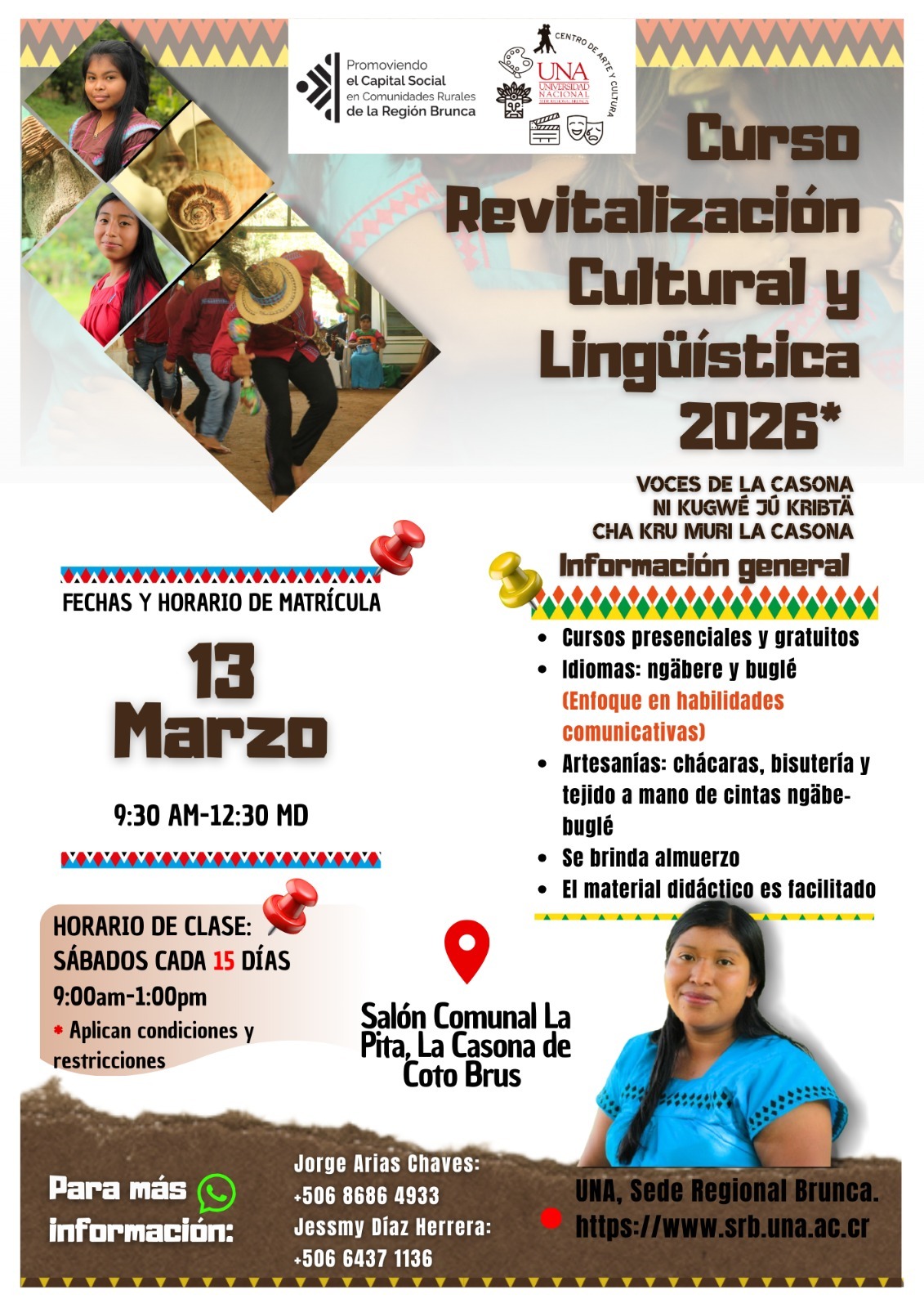 Cursos presenciales y gratuitos de Ngäbere y Buglé (enfoque comunicativo), así como artesanías: chácaras, bisutería y tejido de cintas Ngäbe-Buglé. Se incluye almuerzo y material didáctico.