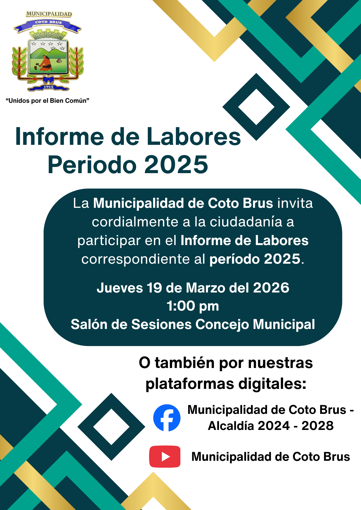 La Municipalidad de Coto Brus invita cordialmente a la ciudadanía a participar en el Informe de Labores correspondiente al período 2025, un espacio donde se dará a conocer el trabajo realizado, los proyectos desarrollados y las acciones emprendidas en beneficio de las comunidades del cantón.