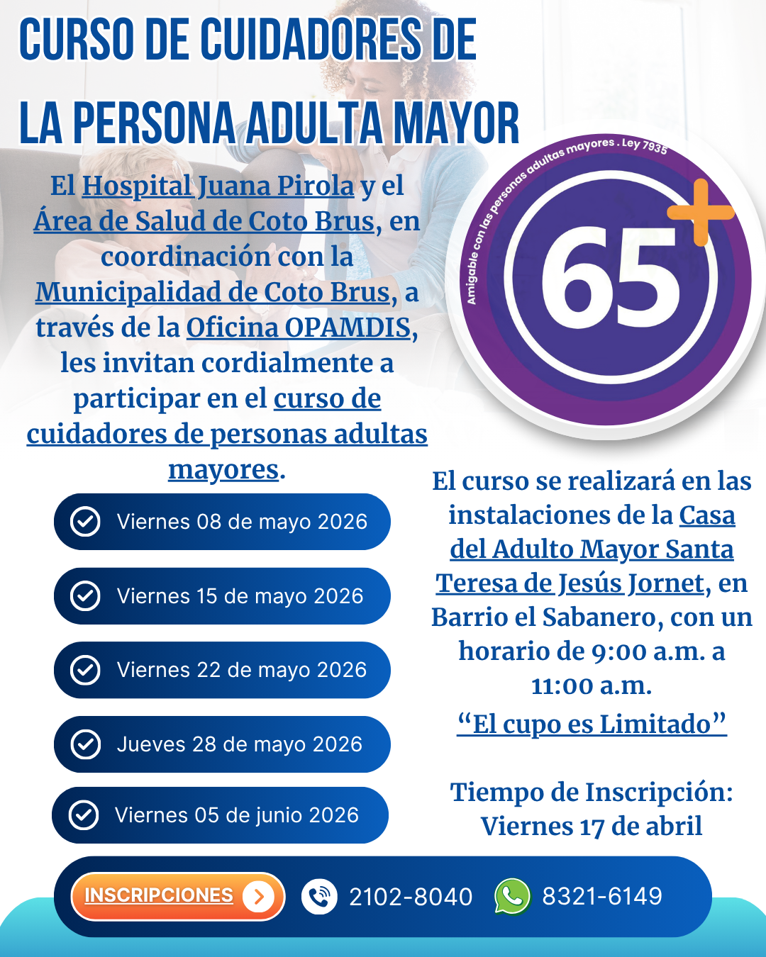 El Hospital Juana Pirola y el Área de Salud de Coto Brus, en coordinación con la Municipalidad de Coto Brus, a través de la Oficina OPAMDIS, les invitan cordialmente a participar en el curso de cuidadores de personas adultas mayores.