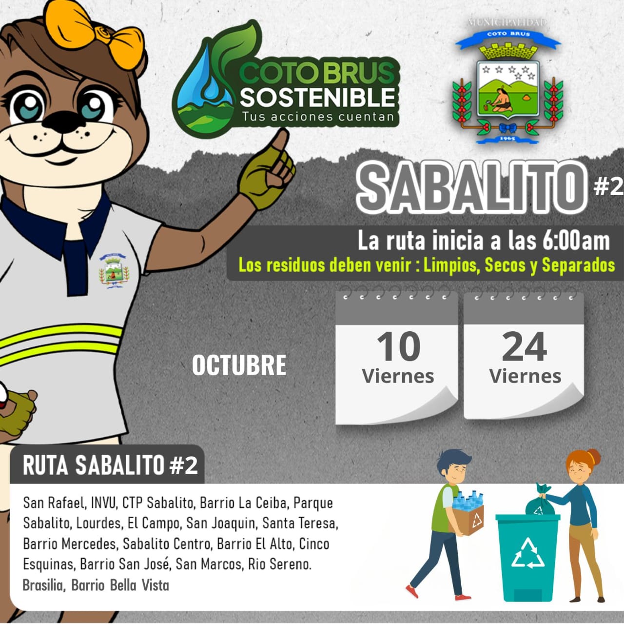 El Departamento de Gestión Ambiental de la Municipalidad de Coto Brus comparte con ustedes las fechas de recolección de residuos valorizables para este mes de octubre.