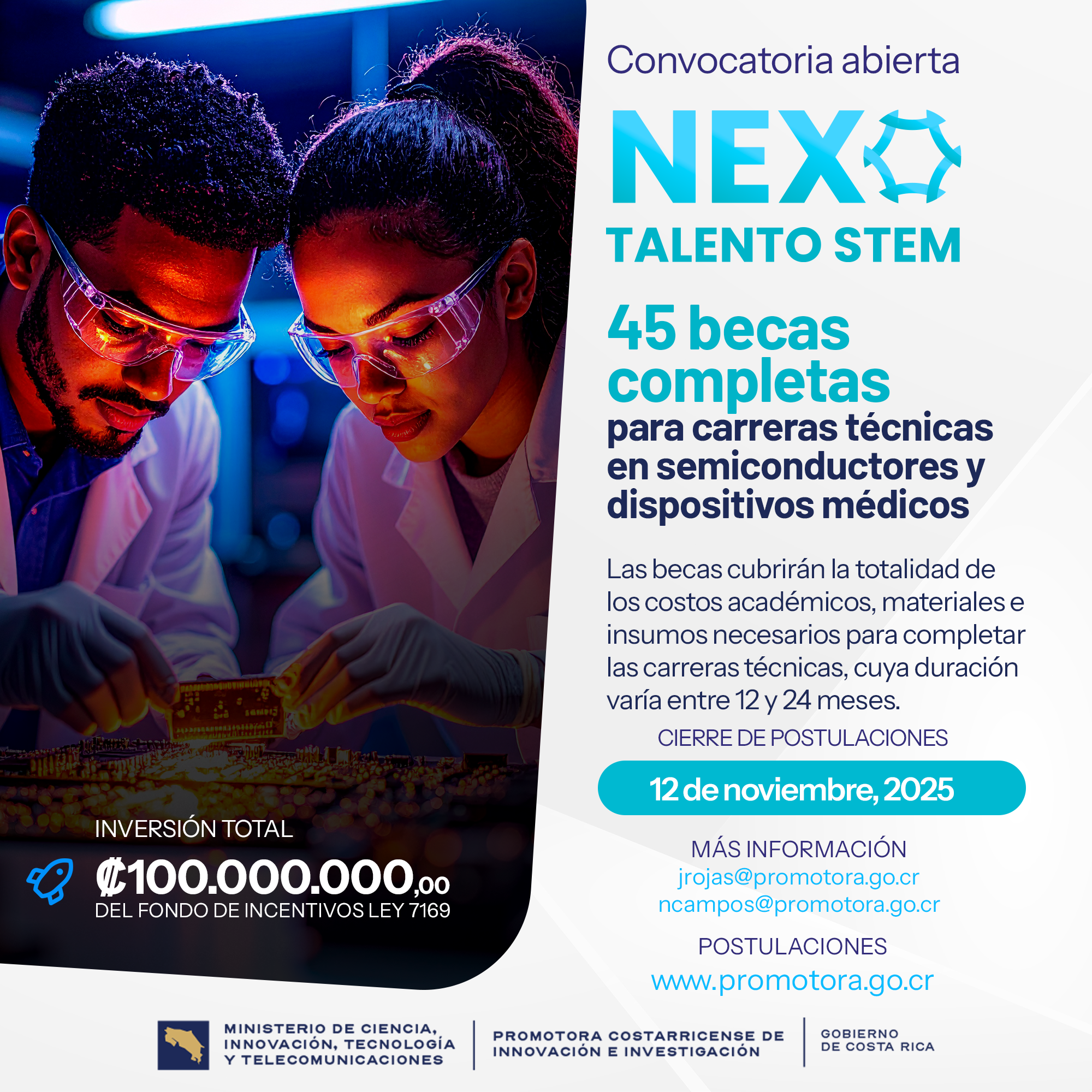 La Promotora Costarricense de Innovación e Investigación informa que se encuentra abierta la convocatoria Nexus Talento STEM 2025, la cual ofrece 45 becas del 100% para cursar carreras técnicas en los sectores de semiconductores y dispositivos médicos, áreas clave para el desarrollo tecnológico y productivo del país.