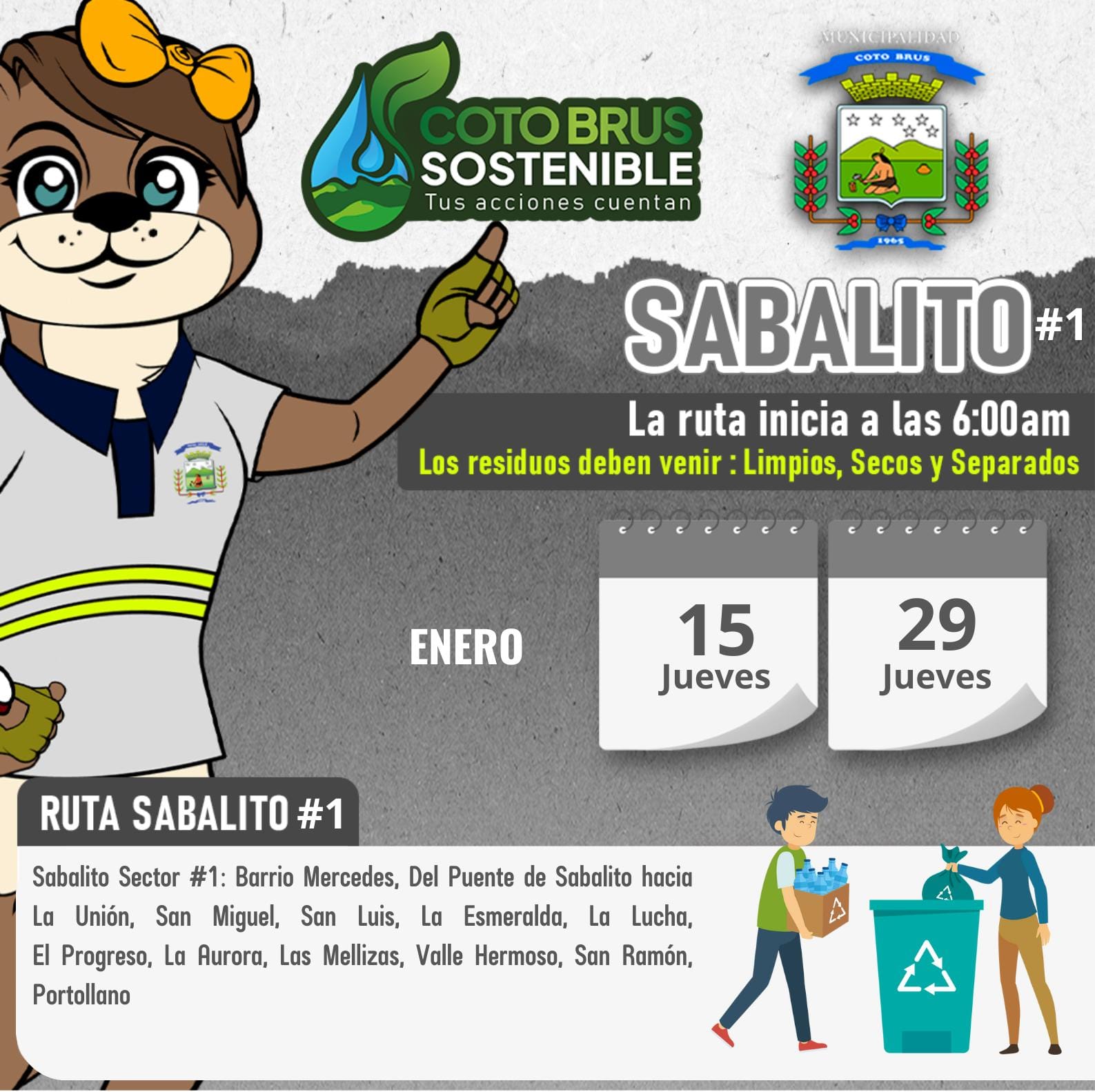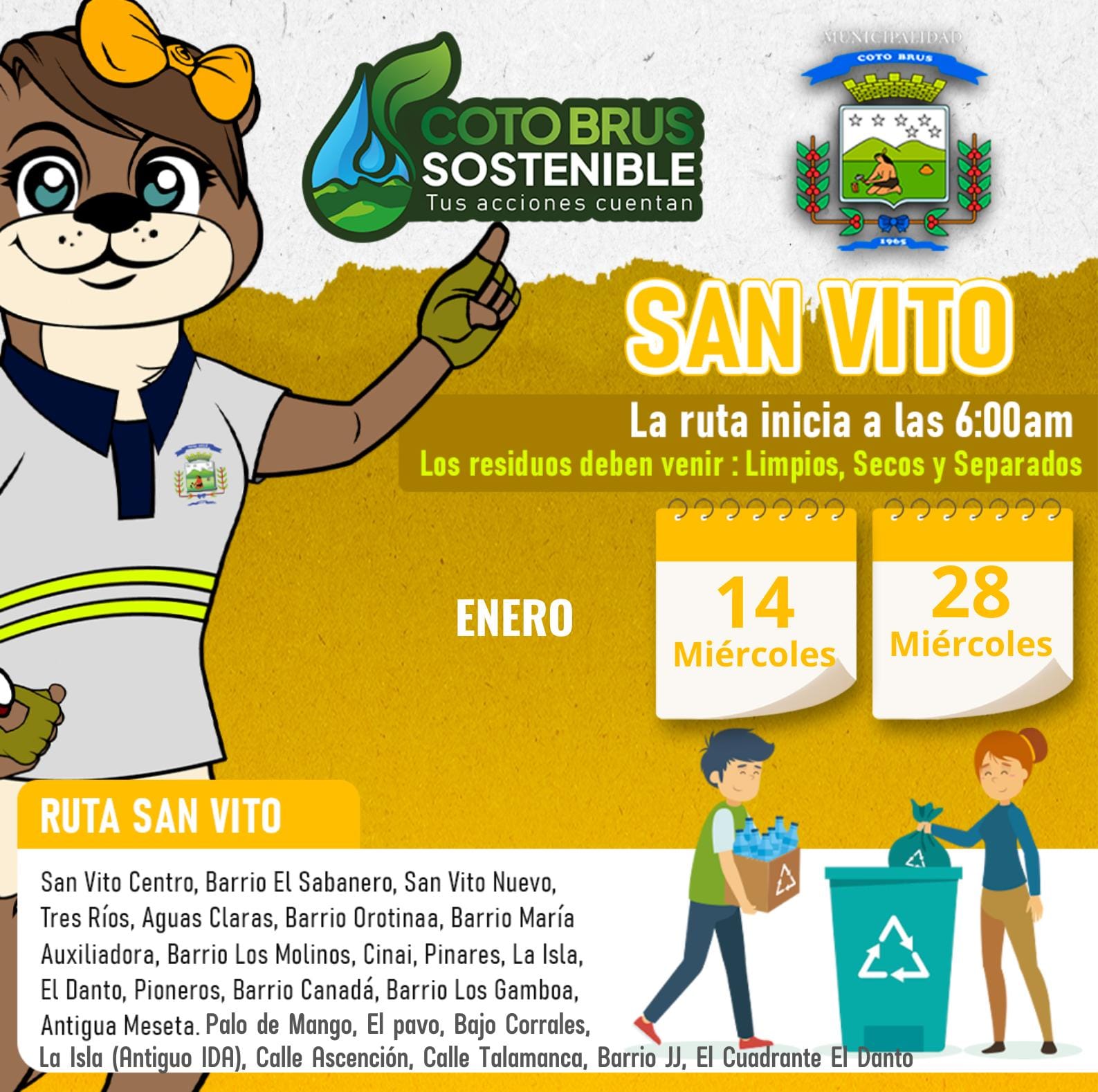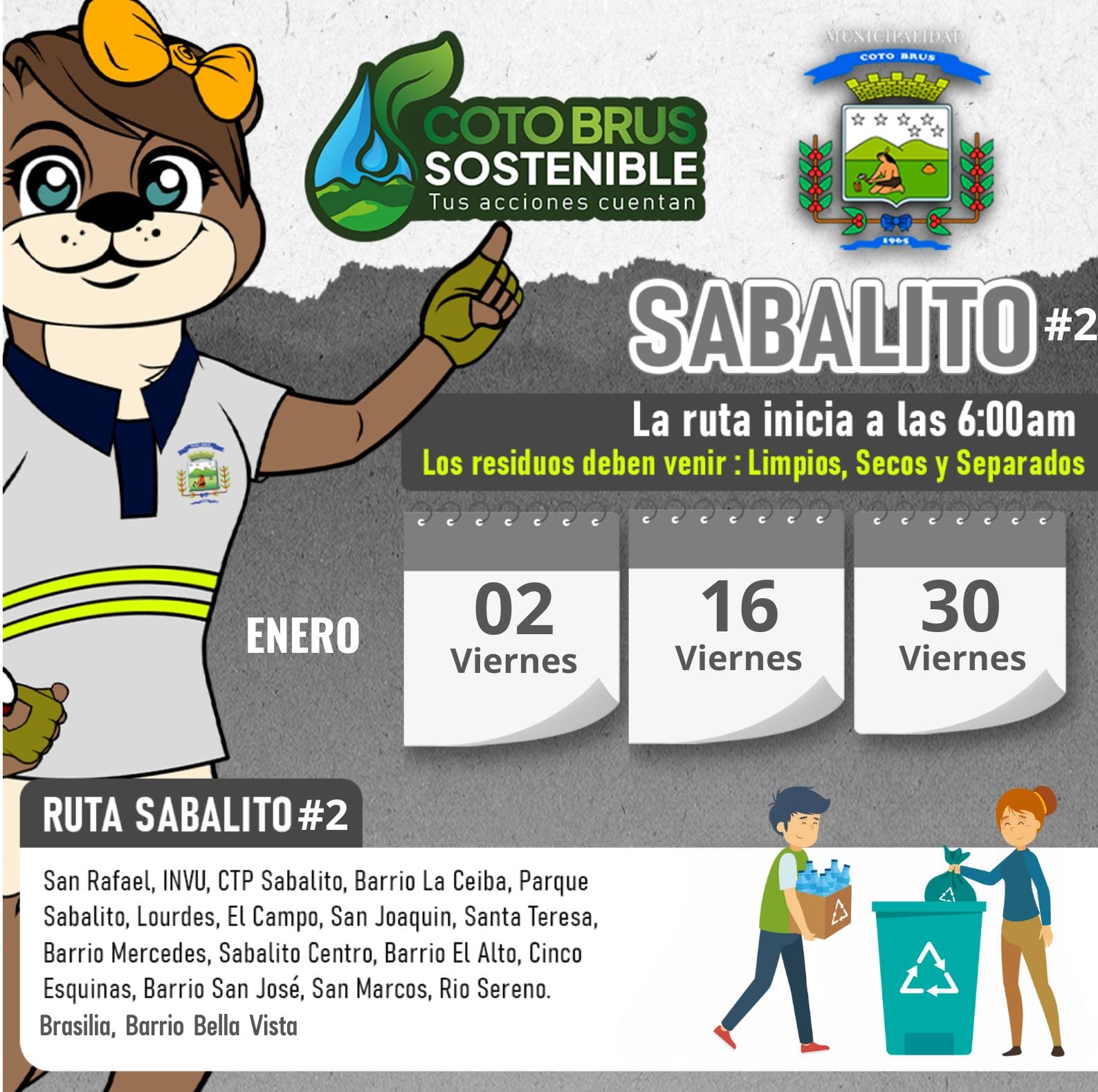 La Municipalidad de Coto Brus informa de las fechas y rutas de la Recoleccion de Reciduos Valorizables para este mes de Enero 2026