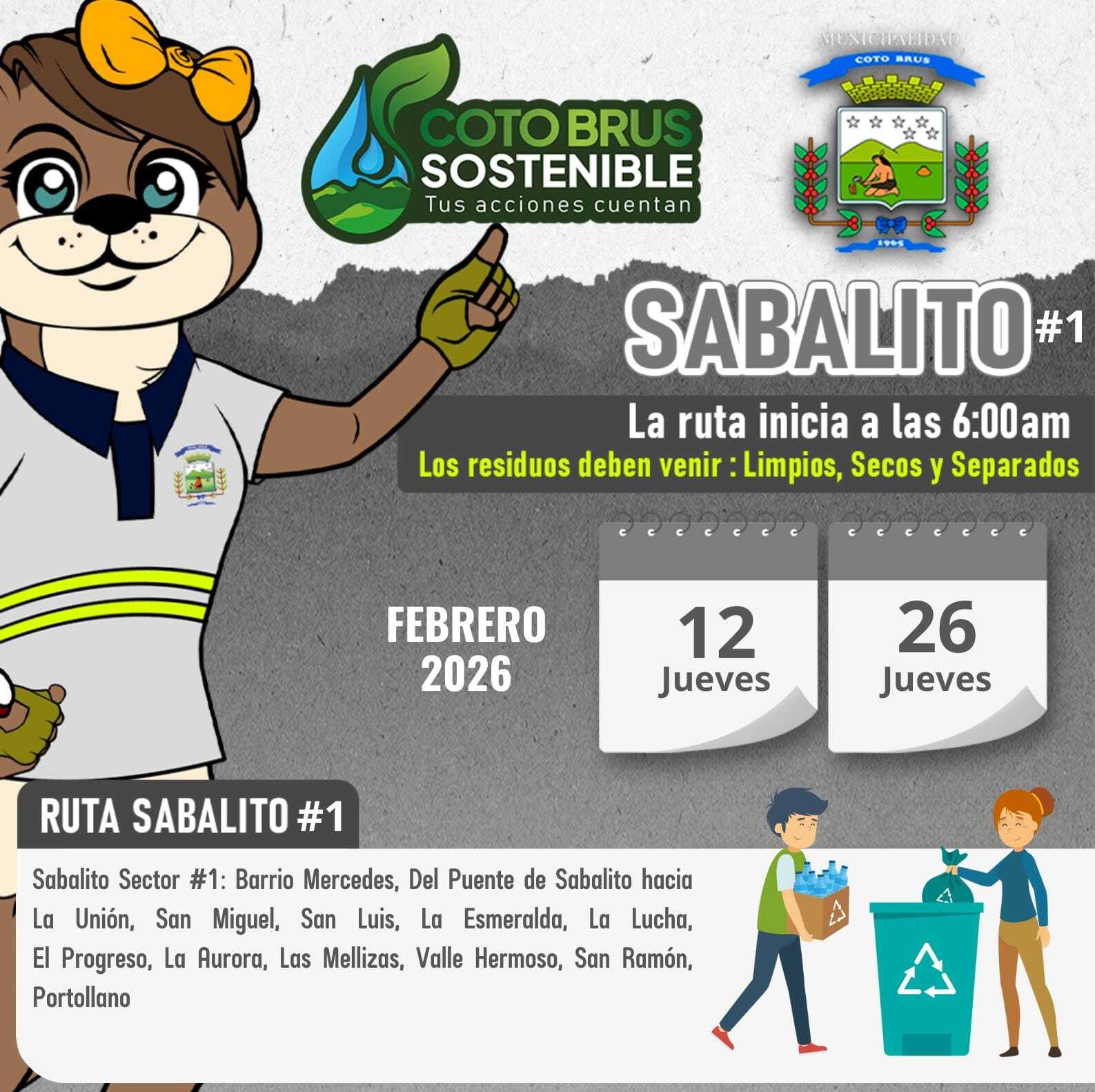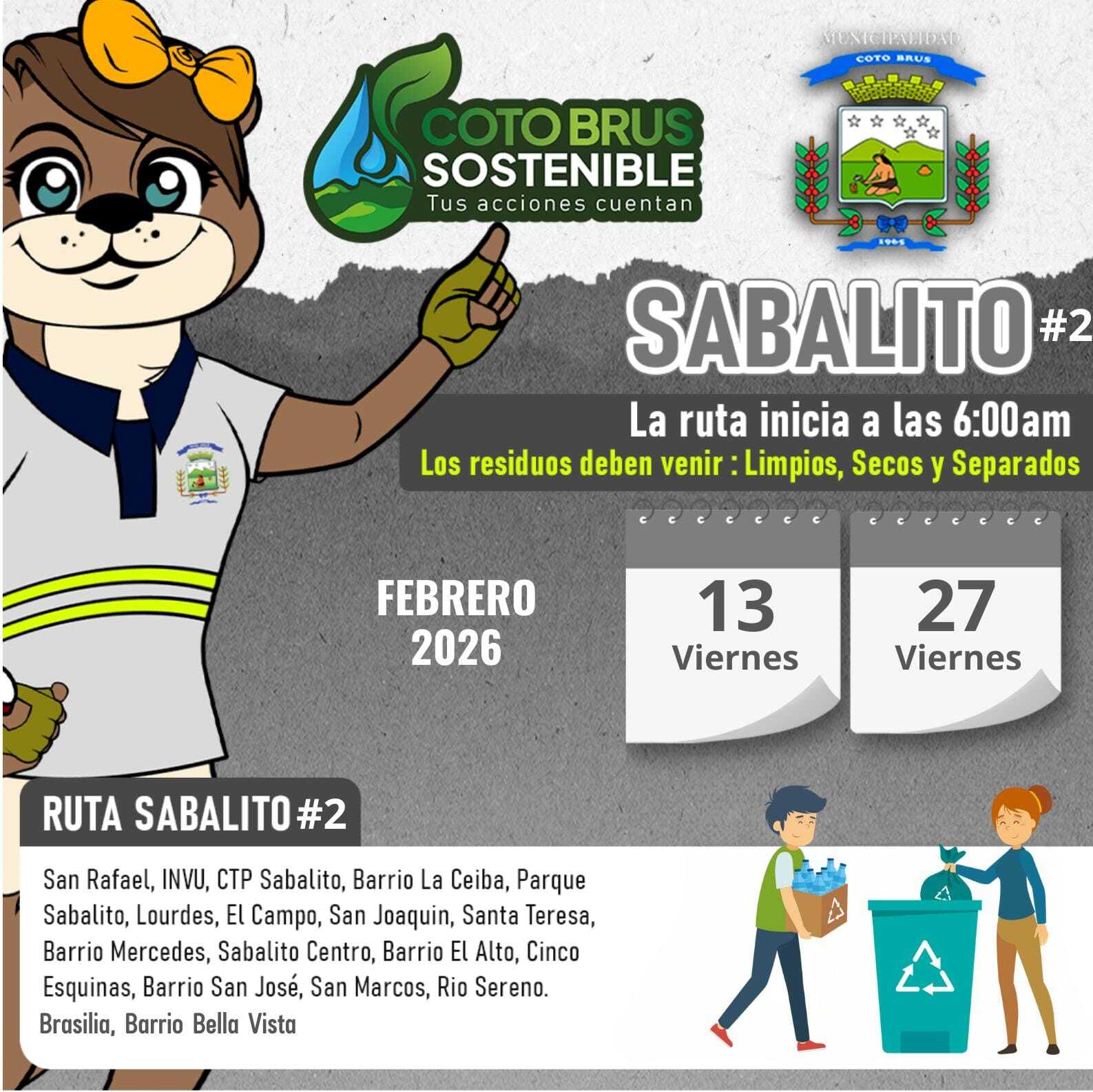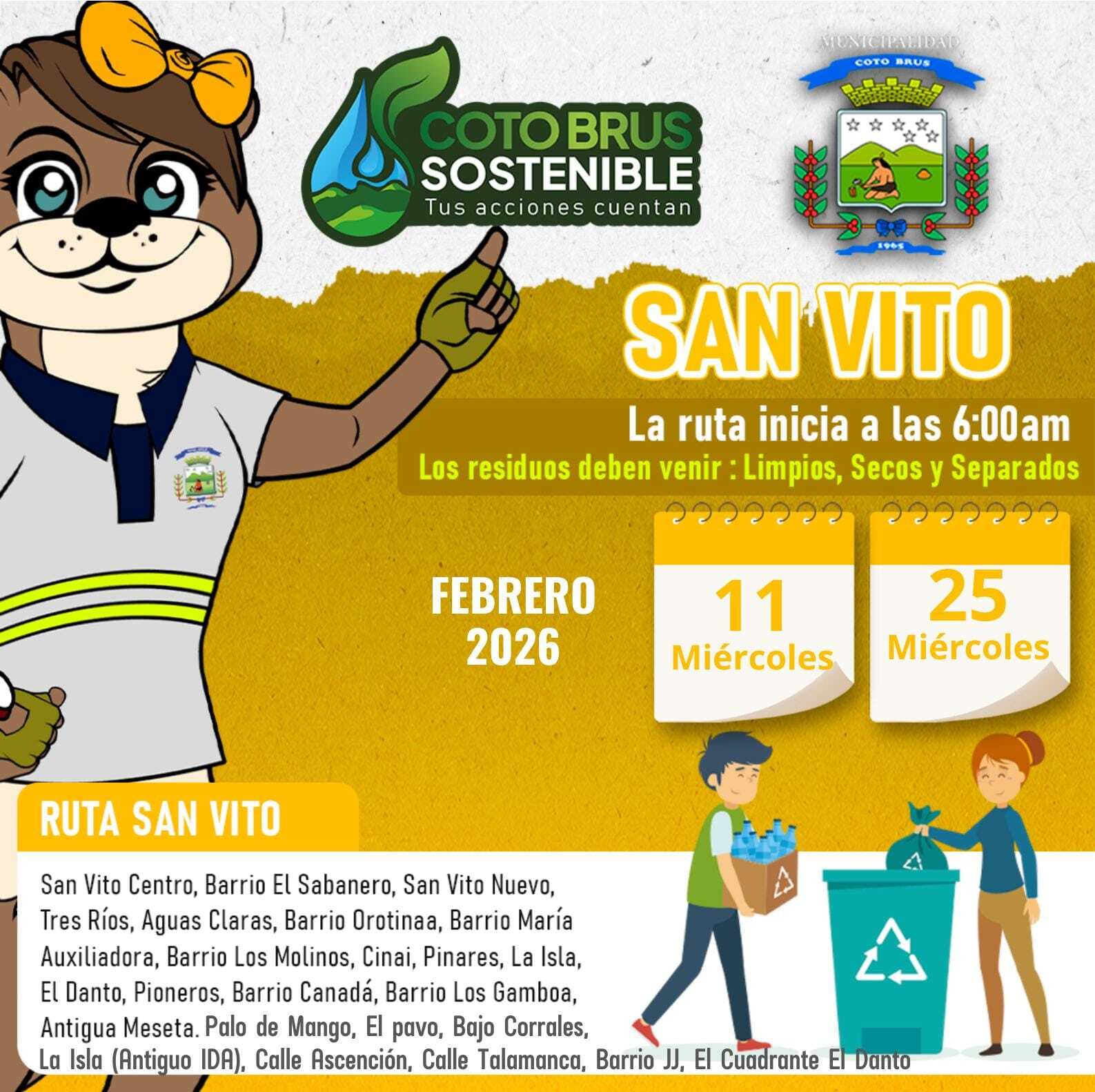 El Departamento de Gestión Ambiental de la Municipalidad de Coto Brus informa a la población las fechas establecidas para la recolección de residuos valorizables correspondientes al mes de febrero.