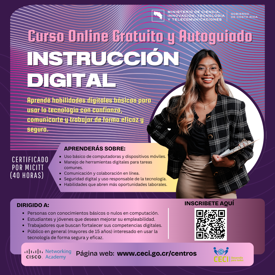 Como parte de los esfuerzos del Ministerio de Ciencia, Innovación, Tecnología y Telecomunicaciones (MICITT) por impulsar la apropiación social del conocimiento, fortalecer las competencias digitales de la ciudadanía y mejorar los perfiles de empleabilidad, especialmente en el marco del Proyecto Talento 4.0, nos permitimos poner en su conocimiento las siguientes oportunidades de formación gratuita: