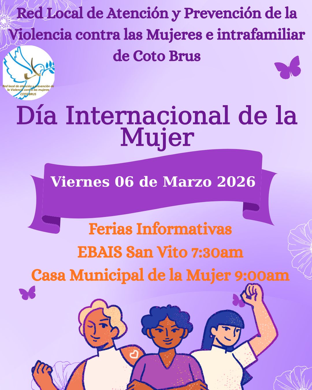 En el marco de la conmemoración del Día Internacional de la Mujer, el Departamento de Gestión Social de la Municipalidad de Coto Brus, en conjunto con la Red de Cuido de Atención y Prevención de la Violencia contra las Mujeres e Intrafamiliar de Coto Brus, les invita cordialmente a participar en las ferias informativas que se estarán realizando este viernes 6 de marzo.